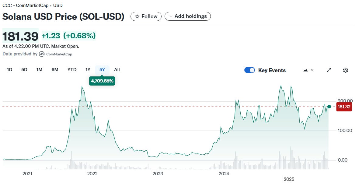 Solana’s price ranged from a low of $96 to a high of $294, covering a range of $198 per share or 206%. Like Ether, shown below, depending on your timing you could have experienced terrific returns, essentially no return, or a loss. It’s all timing, folks, just like being a comedian.