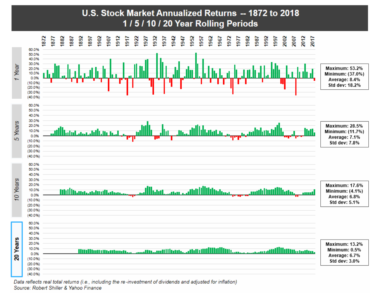 You can certainly ignore risk if you wish, and there are risks you can reasonably ignore if the result of experiencing the risk is immaterial to your desired outcome. If you simply have a somewhat diversified portfolio composed of the S and P 500, and you have 20 years or more to be investing, the probability of principal loss is quite low. This chart shows you that there is almost no chance of losing principal in a rolling 20-year period. So a big part of managing US stock market risk is a willingness and ability to leave money in this market for as long as 20 years.